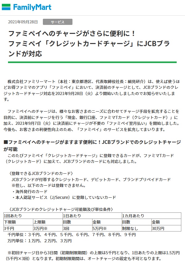 たまたまファミマカードを保有していましたので事なきをえました。ファミペイは他社のJCBカードでも制限は有りますがクレジットチャージに使用可能です。