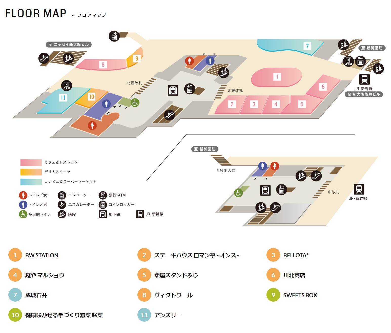 大阪メトロ新大阪駅北改札口を出たところにある食堂街です。