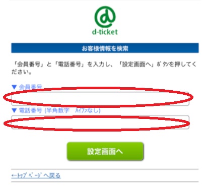 有料会員の会員番号と申込の時に記入した電話番号を入力し、緑色の「設定画面へ」をクリック。