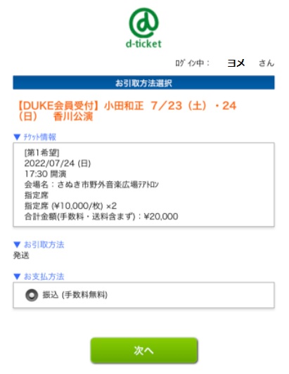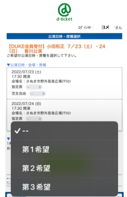 初日、2日目・・・指定席、芝生自由と第3希望まで選択できます。