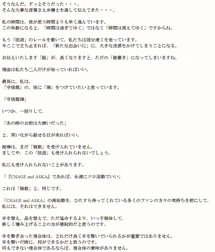 チャゲの意思など聞いてもらっておらず、話し合いもなく、アスカからの書面で脱退決定なのですよ。
