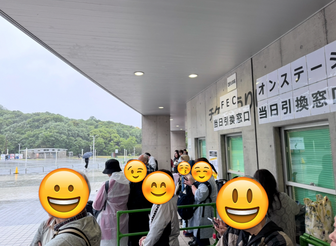2日目公演では悪天候になる事は、天気予報で分かっていたはずです。前回も2日目が豪雨でとんでもない状況になりましたが、今回、その教訓が全く活かされず、初日と同様にグッズ売場もオンステージ受付テントも野外に設営されたまま!案内表示板もそのままで、案の定、強風のため大きな音を立てて倒れました。もし近くにファンの皆さんがいたら下敷きになって大惨事になる所でした。それがあって、慌ててオンステージ受付場所をサブアリーナ一階入口に移設しはりましたが、その列がまたまた雨の中まで伸びて、傘を差しながらの待機となりました。もっと奥まった場所で受付すれば長蛇の列も何とか雨をしのげる場所に並べたのに…。