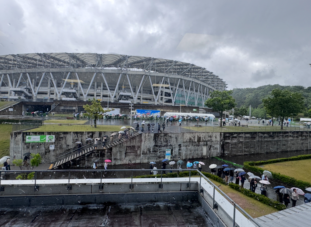 初日とは打って変わって、アリーナ建物の軒下で雨宿り。