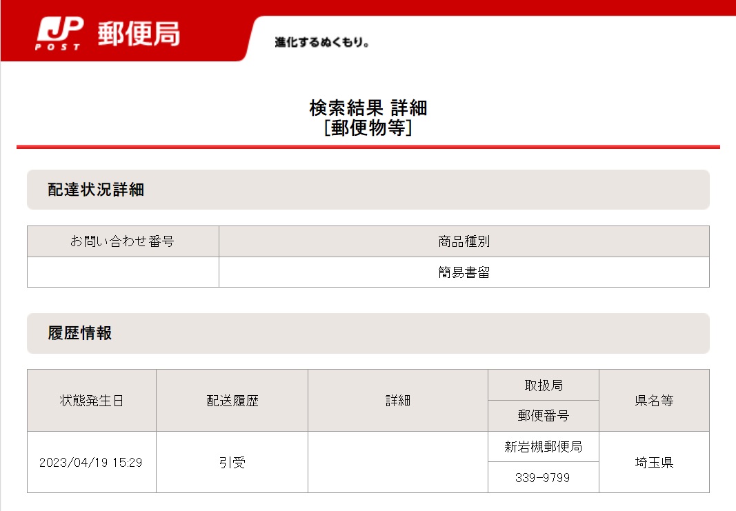 ②配達物追跡番号で調べると埼玉県新岩槻郵便局で4月19日15時29分簡易書留で引受されています。