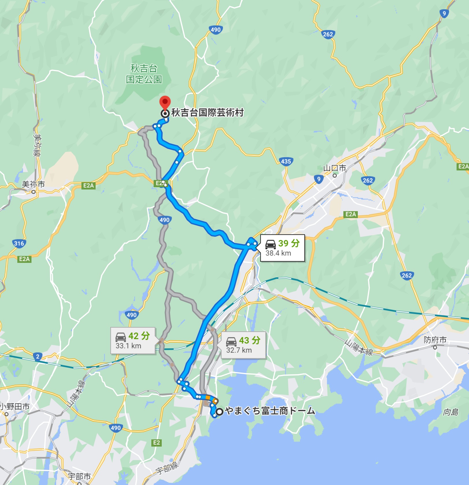 山口きらら博記念公園やまぐち富士商ドームと各イベント会場との車でのアクセス地図を掲載しておきますので距離感を把握し開演時間(17時00分)までに戻ってこれるよ~にプランを立てましょう。